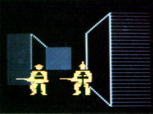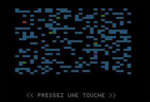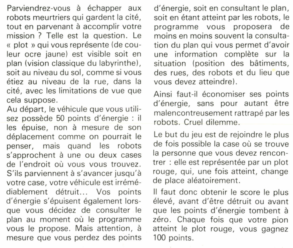 Ce jeux a été publié dans le numéro 23 de J&S , dans la rubrique « logiciel » (page 22), et l’auteur est Michel Brassinne. L’objectif est bien sûr de trouver la sortie mais l’originalité vient du fait que vous voyez le labyrinthe et la sortie (vus d’avion), mais vous ne savez pas où vous vous trouvez ! Les déplacements se font à l’aide des commandes (G)AUCHE, (D)ROITE et EN (A)VANT, ce qui rajoute de la difficulté…