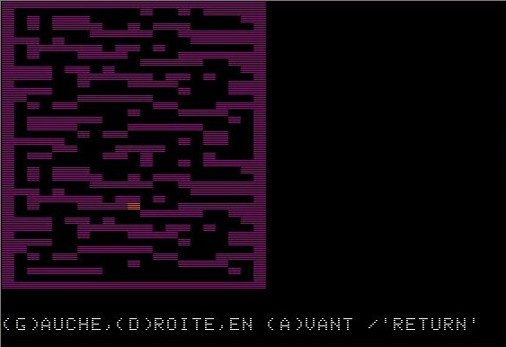 Ce jeux a été publié dans le numéro 23 de J&S , dans la rubrique « logiciel », en page 22. L’objectif est bien sûr de trouver la sortie mais l’originalité vient du fait que vous voyez le labyrinthe (vue d’avion) et la sortie, mais vous ne savez pas où vous vous trouvez ! Les déplacements se font à l’aide de la commande (G)AUCHE, (D)ROITE ou EN (A)VANT, ce qui rajoute de la difficulté…